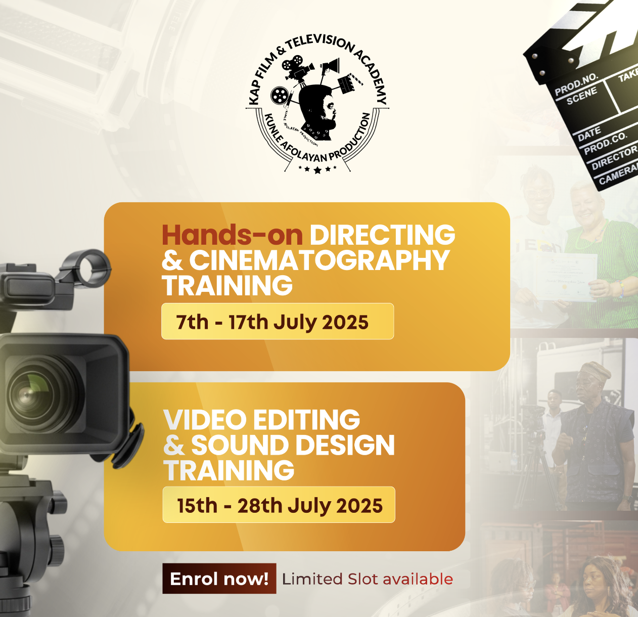 KAP Academy Filmmaking Masterclass May 26 May 26, 2025 @ 8:00 am - June 19, 2025 @ 5:00 pm KAP Academy Filmmaking Masterclass ₦400,000.00