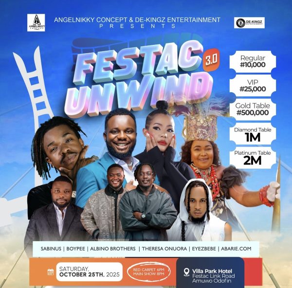 Festac Unwind 3.0 returns bigger and better — a thrilling night of music, comedy, and pure entertainment! Presented by AngelNikky Concept and De-Kingz Entertainment, this third edition promises an unforgettable experience filled with laughter, rhythm, and vibrant performances from some of Nigeria’s finest entertainers. Join top acts including Sabinus, BoyPee, Albino Brothers, Theresa Onuora, and Eyezbebe for a night that […]