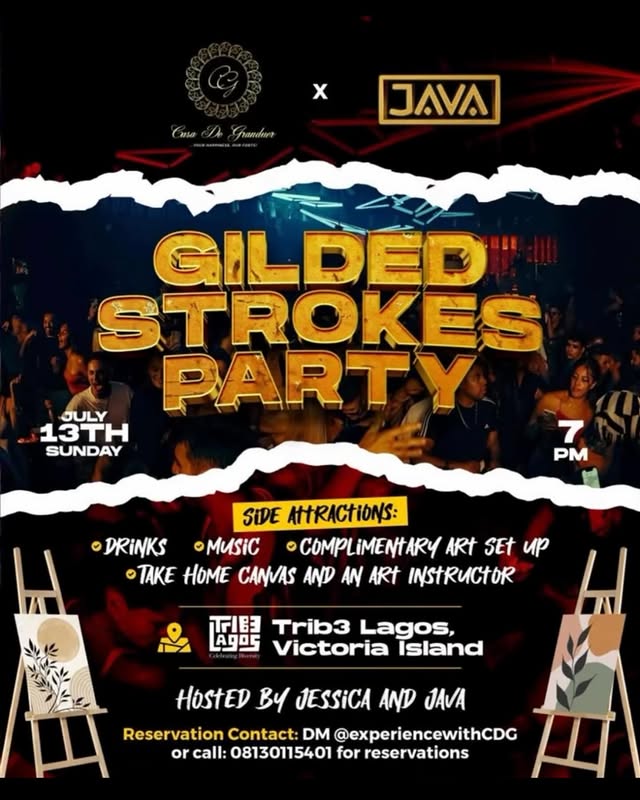 Jul 13 7:00 pm - 11:30 pm Gilded Strokes Party Trib3 Lagos 288b Ajose Adeogun St, Victoria Island, Lagos Event Details Get Directions