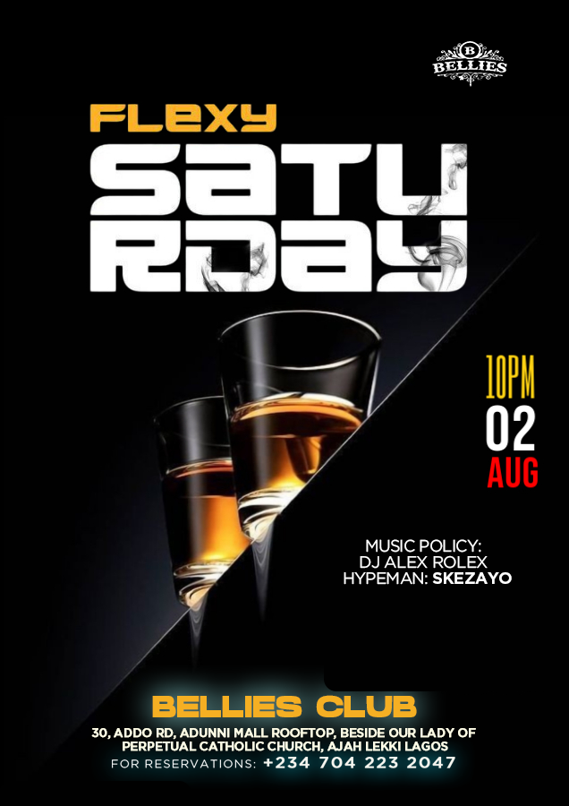 Aug 2 August 2, 2025 @ 10:00 pm - August 3, 2025 @ 3:30 am Flexy Saturday Bellies Club Roof Top, 30 Addo Road, Ajah Event Details Get Directions