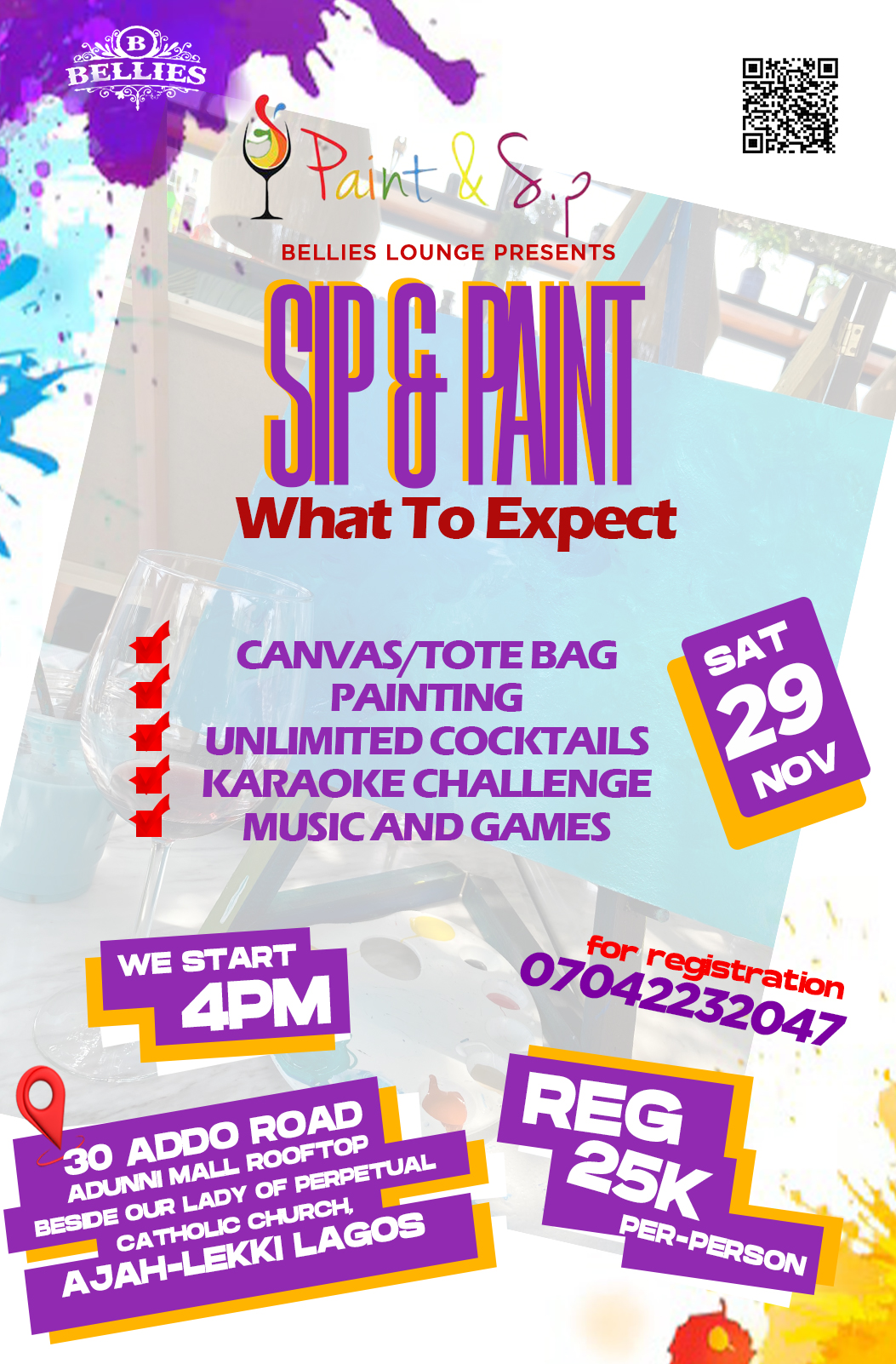 Bellies Lounge presents SIP & PAINT Live in Ajah—a vibrant night designed for fun seekers, art lovers, and anyone ready to unwind in style. It’s the perfect blend of creativity, music, and pure good vibes, all happening under one exciting rooftop atmosphere. Get ready for an unforgettable evening filled with color, laughter, and non-stop entertainment. What to Expect Canvas & Tote Bag