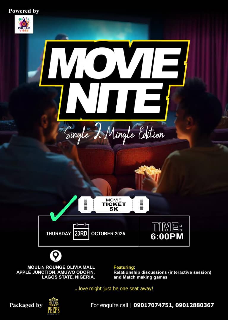 Introducing “SINGLE TO MINGLE": The Singles Movie Night” – a chill, romantic, and flirty night out where Lagos singles come together to vibe, laugh, connect, and maybe… fall in like . Come watch a feel-good love movie under the stars (or in a cozy indoor space), enjoy drinks, small chops, and playful icebreakers that make meeting someone new actually fun. Whether you’re looking