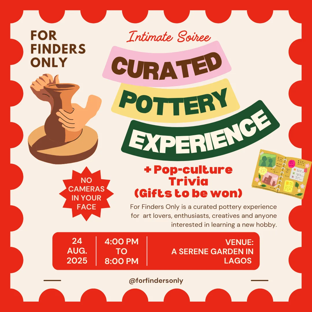RF Gardens Ltd 8, Bayo Kuku Road, Ikoyi, Lagos, NigeriaFor Finders Only is a seasonal event and curated pottery workshop experience designed for beginners, creatives, enthusiasts, and anyone curious about discovering a new hobby. For the first time, we are hosting an Intimate Summer Soiree of pottery, craft, games, lots of food, drinks and so much more! This time, we are adding a TRIVIA to it with GIFTS TO […]
